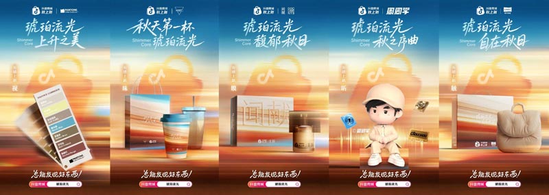 8月7日立秋之際,抖音商城聯合Pantone、WGSN發布趨勢「琥珀流光」,其靈感源自Shimmer Core,意為“微光、閃爍”,主張在大地色系、棕色系為主的沉穩基調上巧添明亮點綴或細閃,為秋冬時尚注入生機與療愈的精神內核。