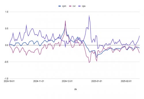 Meta數(shù)據(jù)顯示,節(jié)后至1月中旬廣告成本下降約50%,但轉(zhuǎn)化率依舊維持高位(⑦)。這段被稱(chēng)為“Q5”的階段,成為越來(lái)越多品牌進(jìn)行再營(yíng)銷(xiāo)與品牌沉淀的窗口期。